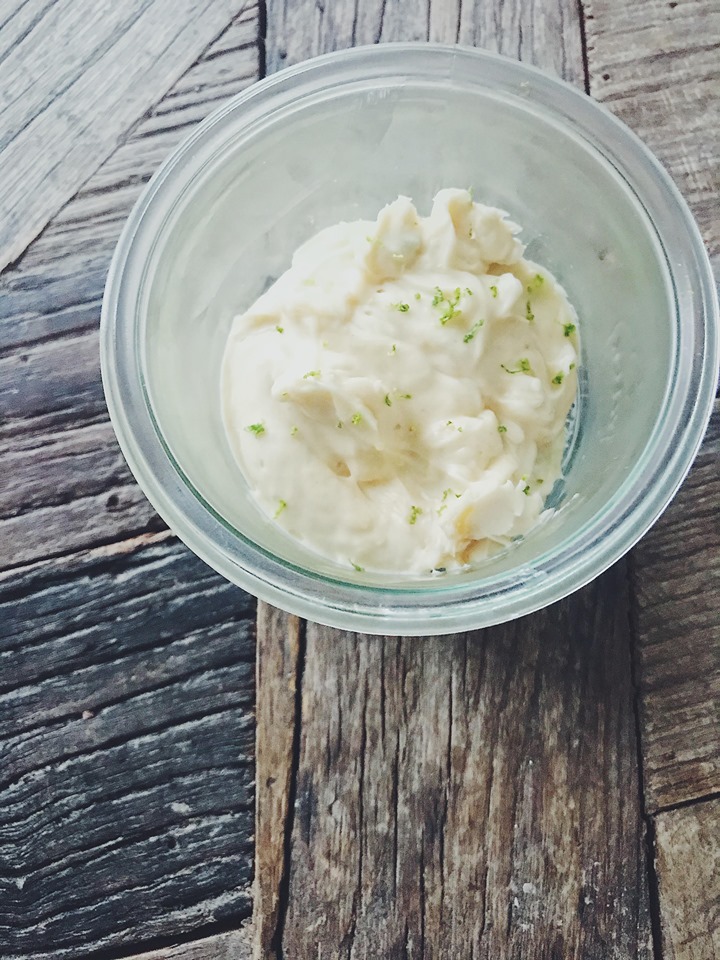 3. Tag den anden del af smørret og pisk det sammen med det brunet smør sammen med noget revet limeskal. Put det over en en fin skål og stil det på køl til det bliver stift. Hvis du har en sifonflaske, kan du med fordel bruge den og putte det i en skål. Så bliver det hvidt og luftigt og meget smukt at se på.